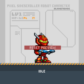 This asset pack contains a futuristic robot character for sidescroller shoot em up games. Character size is 40 x 48 pixels and includes the following animations: